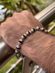 Featuring authentic Rudraksha beads encased in sleek silver plating, this bracelet not only promotes peace and positive energy but also adds a sophisticated touch to your everyday look.