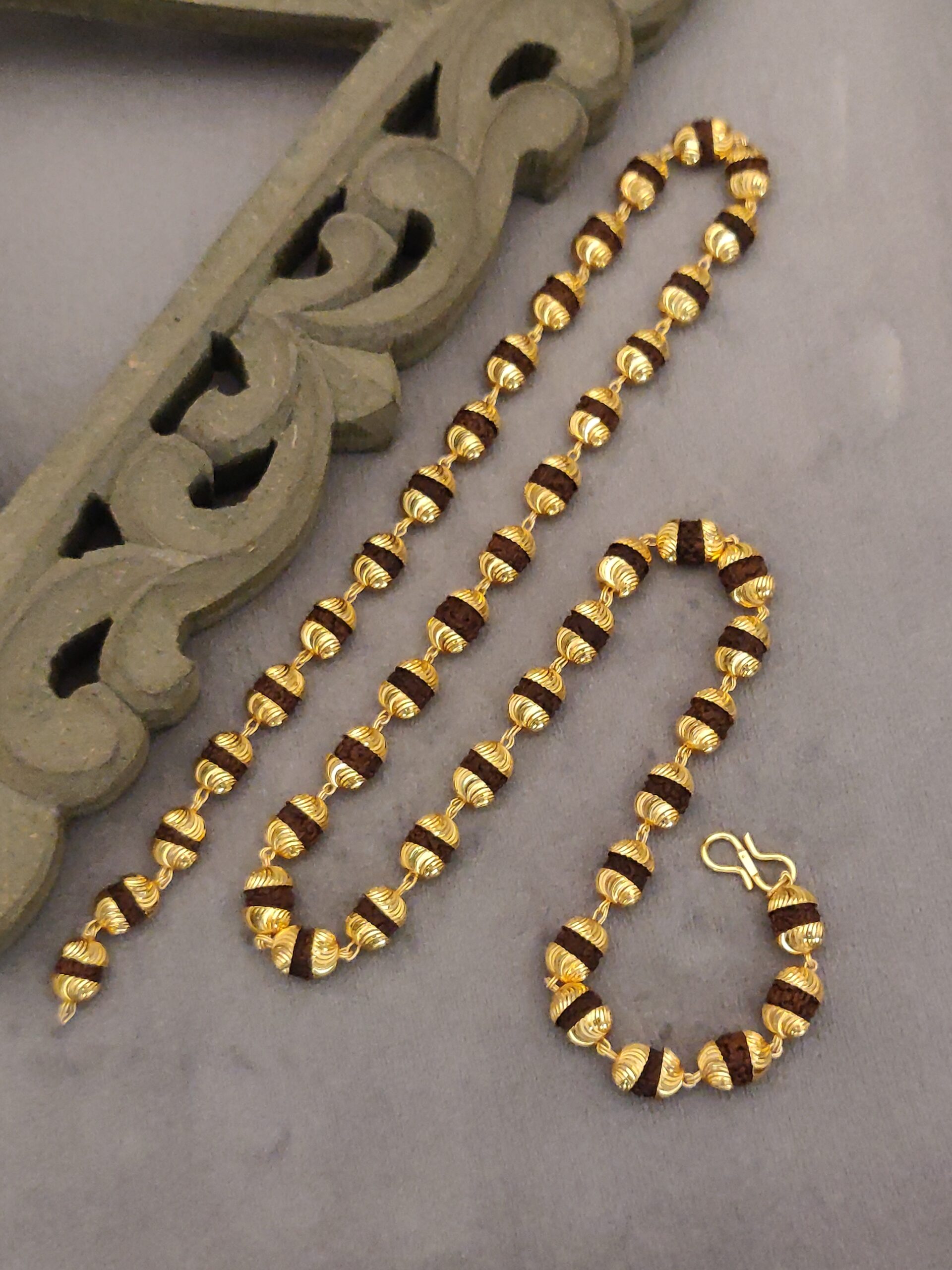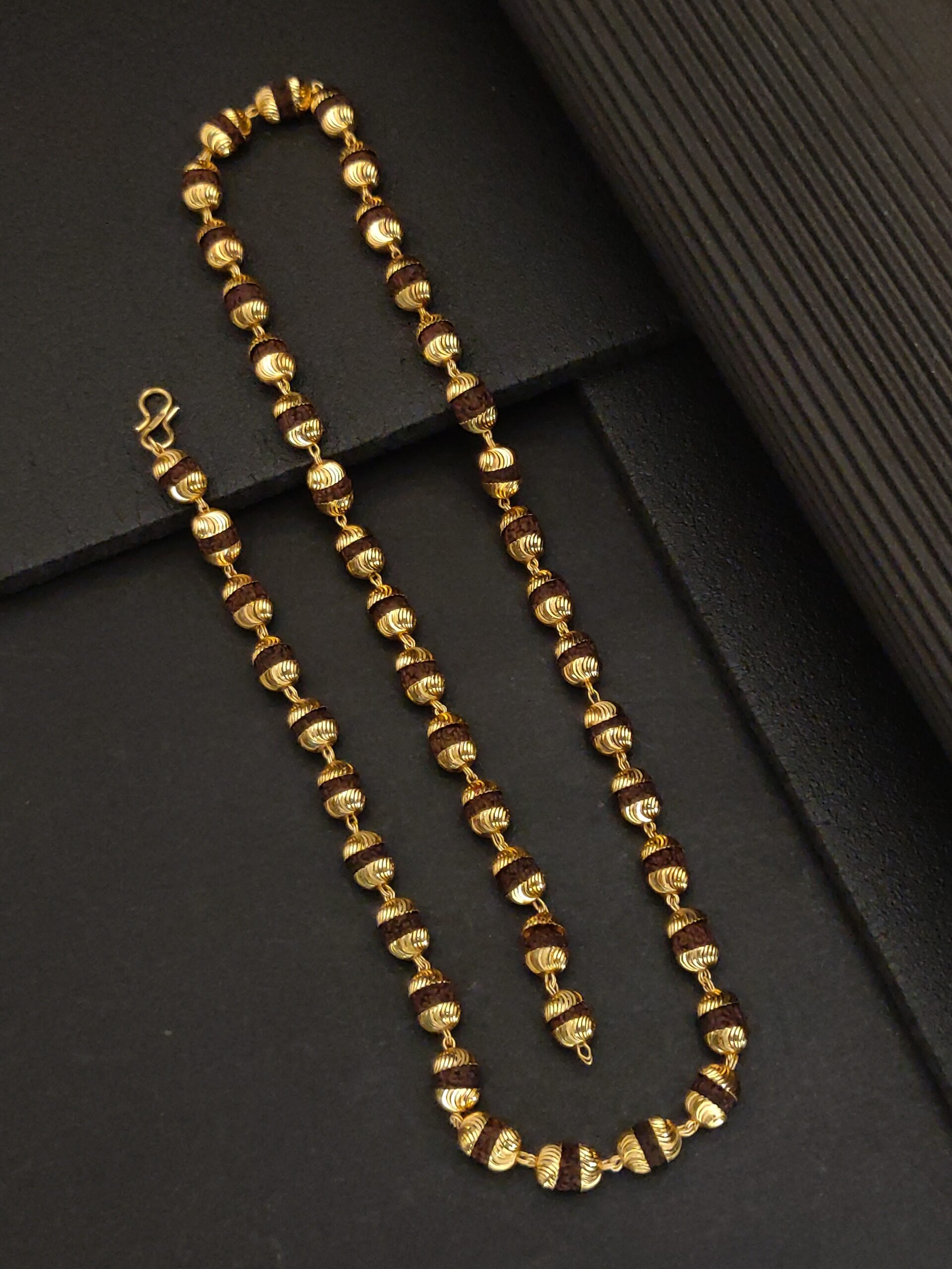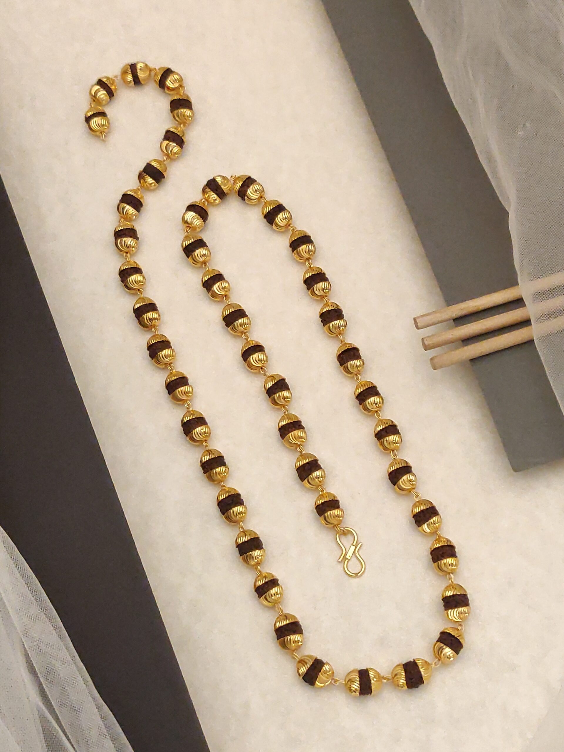 - Luxurious Gold-Plated Accents: The gold-plated spacers add a touch of opulence to the traditional Rudraksha mala.