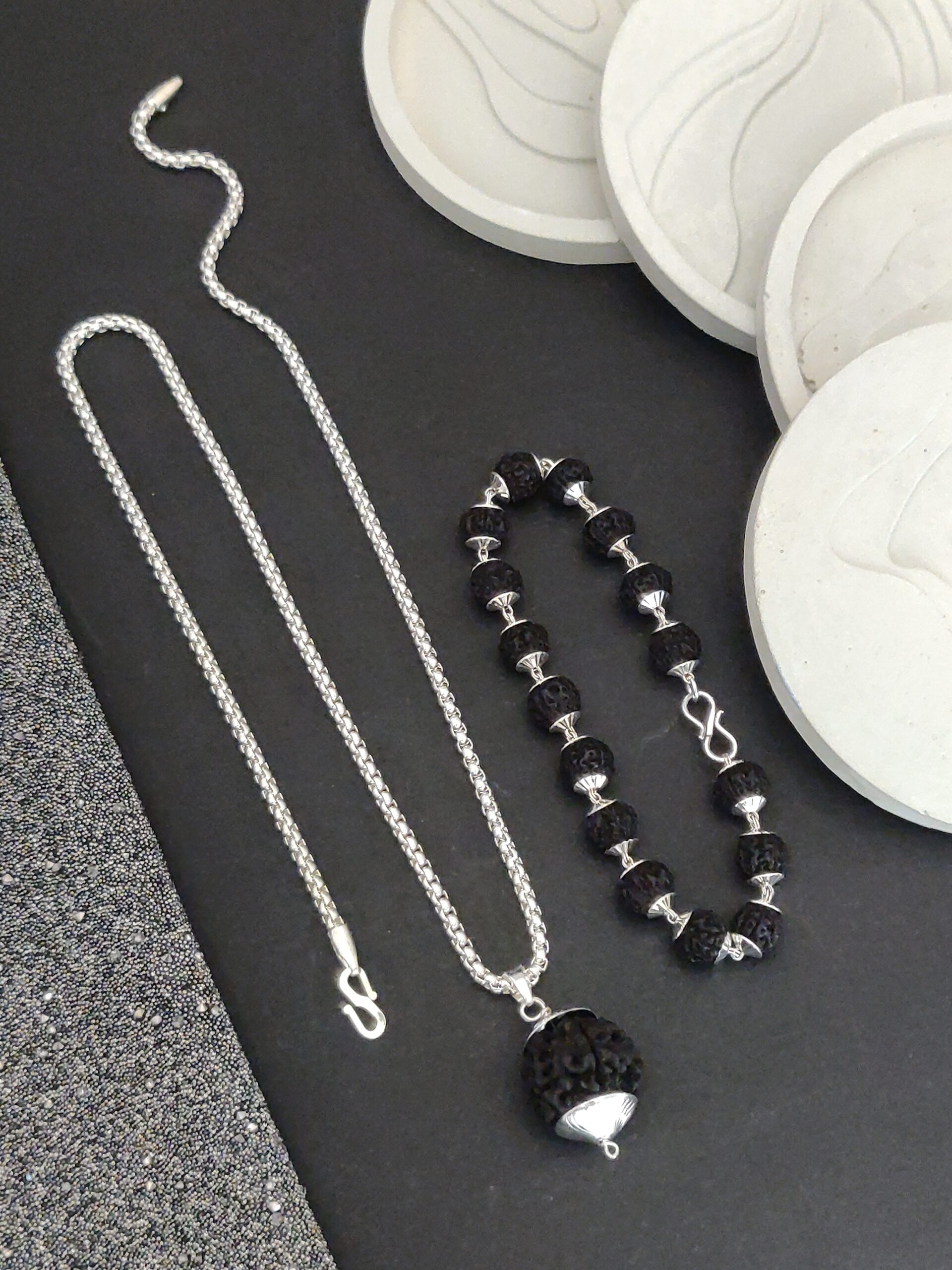 Elevate your spiritual journey with this Silver Plated Rudraksha Combo, which includes a beautifully crafted Rudraksha bracelet, a matching Rudraksha pendant, and a silver-plated chain.